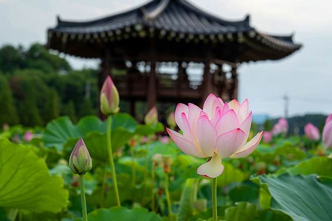 연꽃단지 중앙에 마련된 정자는 뜨거운 햇볕을 피할 수 있는 이상적인 장소로, 연꽃 사이사이에 피어있는 다양한 여름꽃들과 함께 아름다운 풍경을 제공합니다.