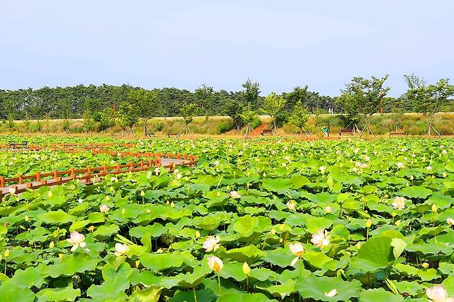 무안 회산백련지는 10만 평의 광대한 연못을 연꽃으로 채워, 그 아름다움이 2001년에 기네스북에 오를 만큼 세계적으로 인정받은 장소인데요. 이곳의 백련은 다른 곳보다 늦은 시기에 피어나기 때문에 연꽃 축제도 7월 말~8월 초에 개최되는 것이 특징입니다.