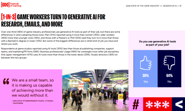 이런 변화는 업계 내부 분위기에서도 드러난다. 게임 개발자 컨퍼런스(GDC)의 2026년 조사에 따르면 게임업계 종사자의 36%는 생성형 AI를 업무에 활용하고 있다. 52%는 생성형 AI가 업계에 부정적 영향을 미친다고 답했다. 비용 절감 압박은 커졌지만 창작의 중심까지 AI에 넘기는 데는 여전히 경계가 강한 셈이다.