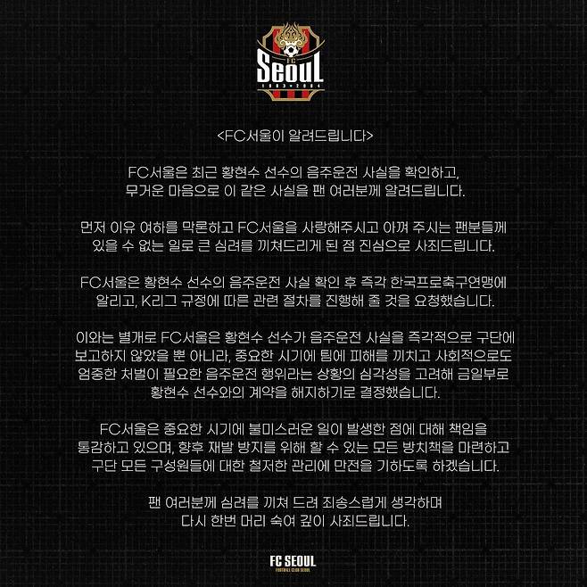 서울은 25일 "최근 황현수의 음주운전 사실을 확인했다. 있을 수 없는 일로 심려를 끼쳐 죄송하다"고 전했습니다. 또한, "황현수는 음주운전 사실을 바로 구단에 보고하지 않았고, 중요한 시기에 팀에 피해를 끼치며 사회적으로도 엄중한 처벌이 필요한 음주운전 행위를 저질렀다. 상황의 심각성을 고려해 오늘부로 황현수와 계약을 해지한다"고 밝혔습니다.