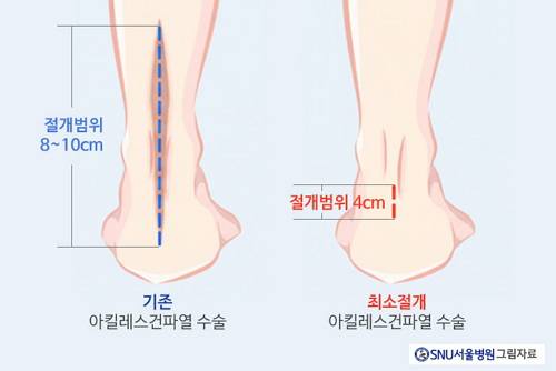 전통적인 아킬레스건 봉합술은 절개 범위가 8~10cm 정도로 꽤 넓다. 상처가 큰 만큼 감염이나 유착 같은 합병증 위험도 올라간다.