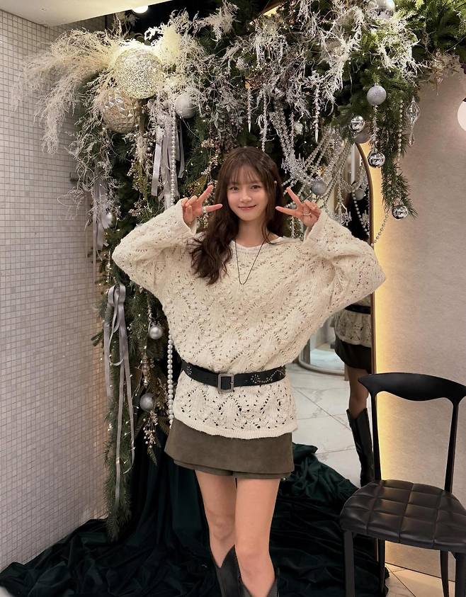 양손으로 브이를 그리며 밝게 웃는 그녀의 모습은 화려한 트리 장식보다 더 눈부신 존재감을 드러내고 있답니다.