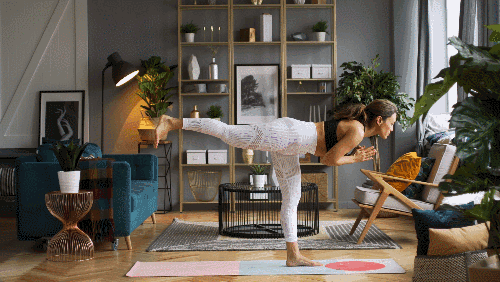 매트에 서서 오른쪽 무릎을 들어 올리고, 손을 머리 위로 뻗습니다. 왼발로 균형을 잡으며 오른발을 뒤로 뻗어 몸을 T자 모양으로 만듭니다. 자세를 최대한 유지한 후, 다시 원래 자세로 돌아옵니다. 이 동작을 반복한 후, 다리 위치를 바꿔서 운동합니다.