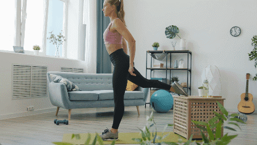 박스나 소파 위에 오른발을 올리고 시작합니다. 무릎을 구부리면서 몸 전체를 천천히 바닥으로 내렸다가 돌아옵니다. 이 동작을 반복한 후, 다리를 바꿔서 운동합니다.