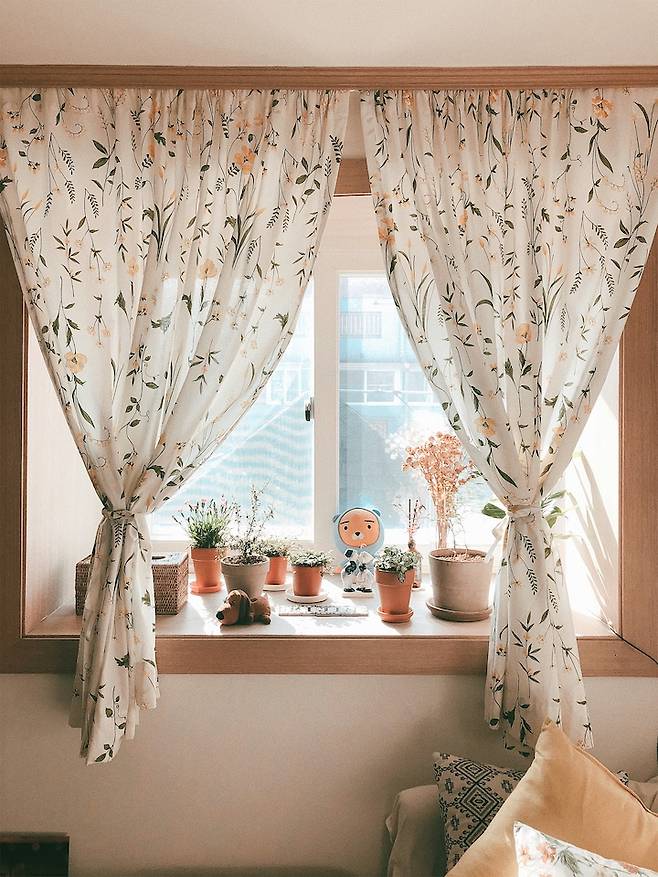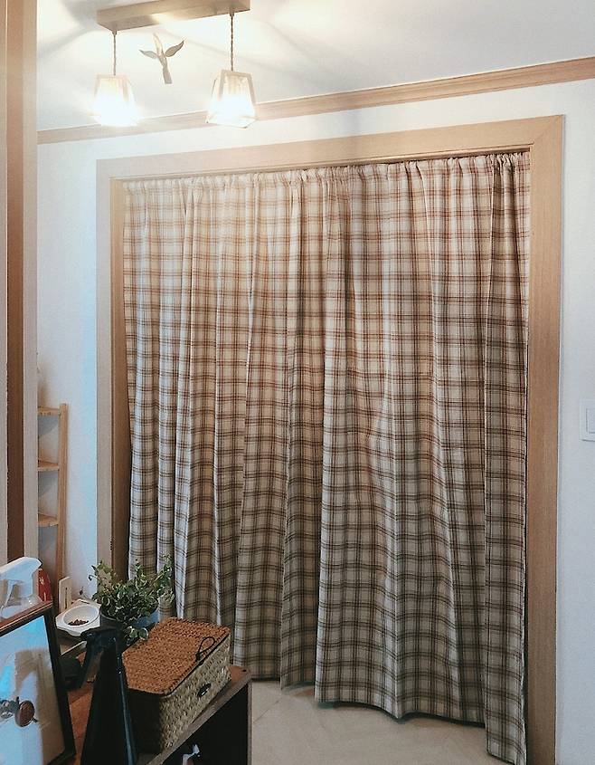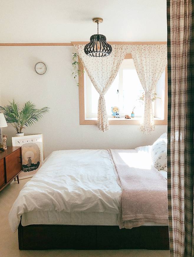 평상시에는 열어놓고 잠잘 때만 커튼을 치면 잘 때 안정적인 느낌도 들고, 커튼 디자인에 따라 집의 느낌도 다르게 보일 수 있을 것 같아서 커튼으로 결정!
