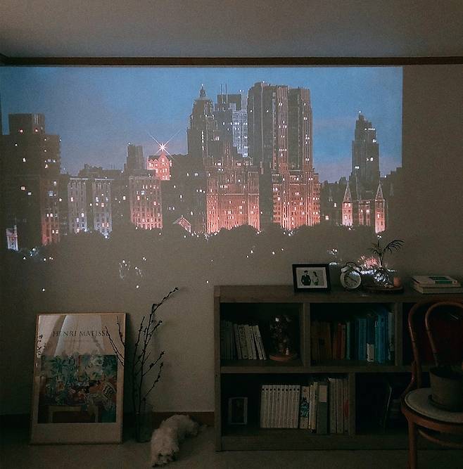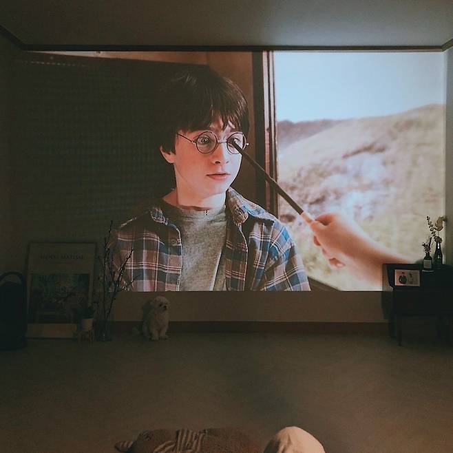 예전부터 너무나 하고 싶었던 벽 한 면 전체에 빔 쏘기. 드디어 하게 되었습니다. 소파에 앉아서 보면 영화관 부럽지 않습니다. 특히나 코시국에 여기서 정말 많이 즐겼던 것 같아요.