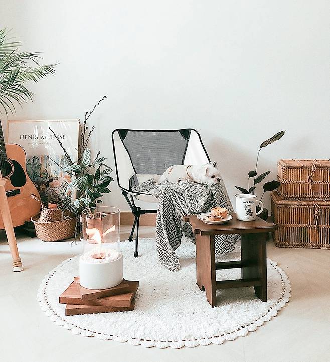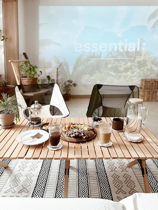 예전엔 거실이 좁아서 하지 못했던 홈 캠핑도 즐기게 되었어요.