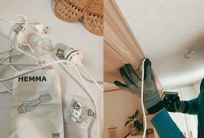 처음 공간을 바꾸고 평상 천장 쪽에 조명이 하나 있으면 좋을 것 같단 생각이 들었는데, 전기공사를 할 수가 없어서 고민하다가 다이소에서 산 후크를 이용해서 조명을 달았습니다.