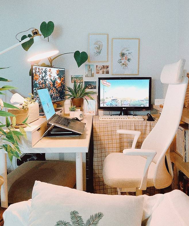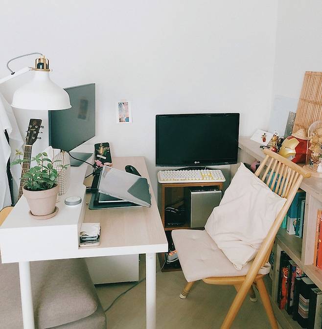 의자는 원목이 예쁘긴 하지만 컴퓨터 두 대를 오가며 사용하다 보니 아무래도 불편하더라고요. 몇 달을 검색하다가 찾은 화이트 의자입니다. 디자인도 마음에 들고 편해서 진짜 만족해요.