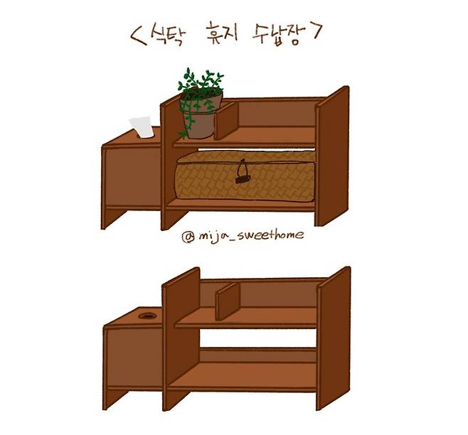 식탁 위에 항상 약통과 휴지 등등 지저분하게 널브러져 있었는데 이걸 해결하기 위해 미니 수납장을 직접 만들어보았습니다:) 제가 아이패드로 그린 그림을 남편이 스케치업으로 옮기고, 목재를 주문해서 직접 만들었습니다.