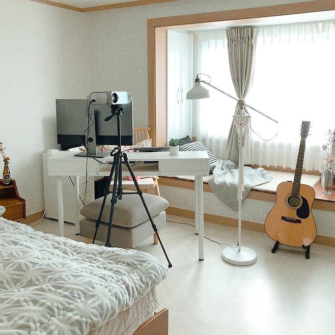 작은방을 옷방으로 만드는 바람에 어쩔 수 없이 안방에 작업 공간을 마련했습니다. 한쪽은 침대, 반대편은 작업 공간.