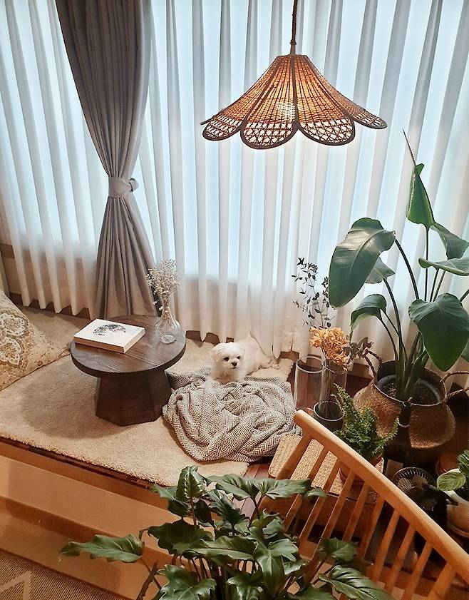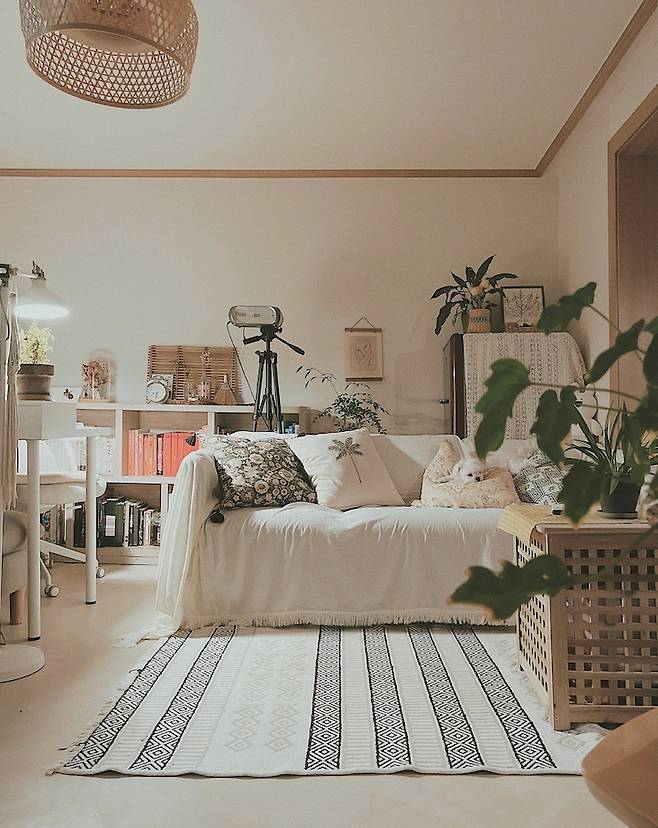 처음부터 계획한 건 아니었지만 소파를 배치하다 보니 자연스레 옆에 평상이랑 이어져서 공간을 더 효율적으로 사용할 수 있었습니다.