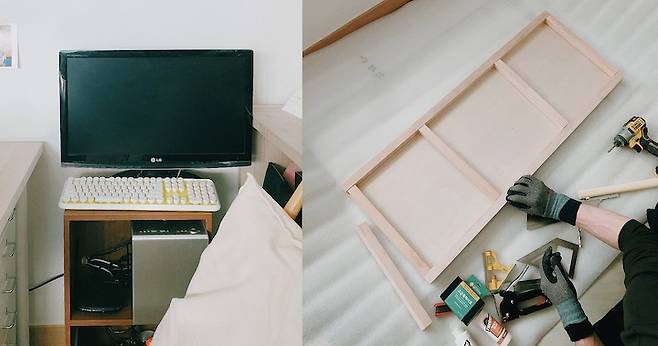 메인 책상은 이케아 책상을 사용했고요. 옆에 서브 책상은 남편이 상판만 만들어서 위에 천을 덮어서 사용했는데 간단하게 만든 거치고는 튼튼하고 만족합니다.