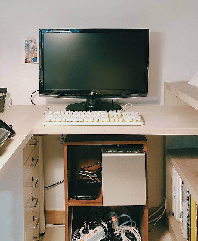 저는 작업할 때 등 뒤는 막혀있고 앞이 확 뚫려있어야 안정감이 와서 작업이 잘 되는데요. 이때는 완전 반대로 된 배치여서 실제로 여기서 작업을 거의 하진 않았습니다. 책상을 사놓고도 굳이 아이맥을 들고 거실로 나가서 작업을 하는 그런 수고스러운 일을 했었더랬죠,,,,