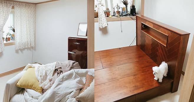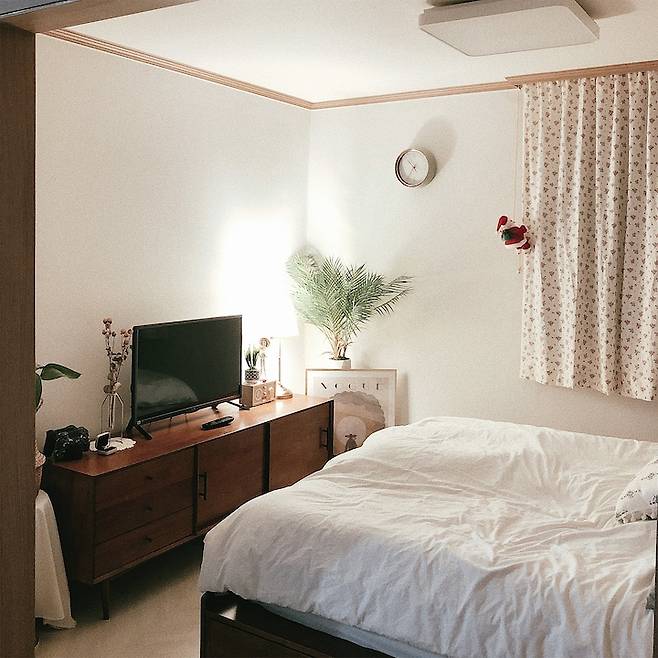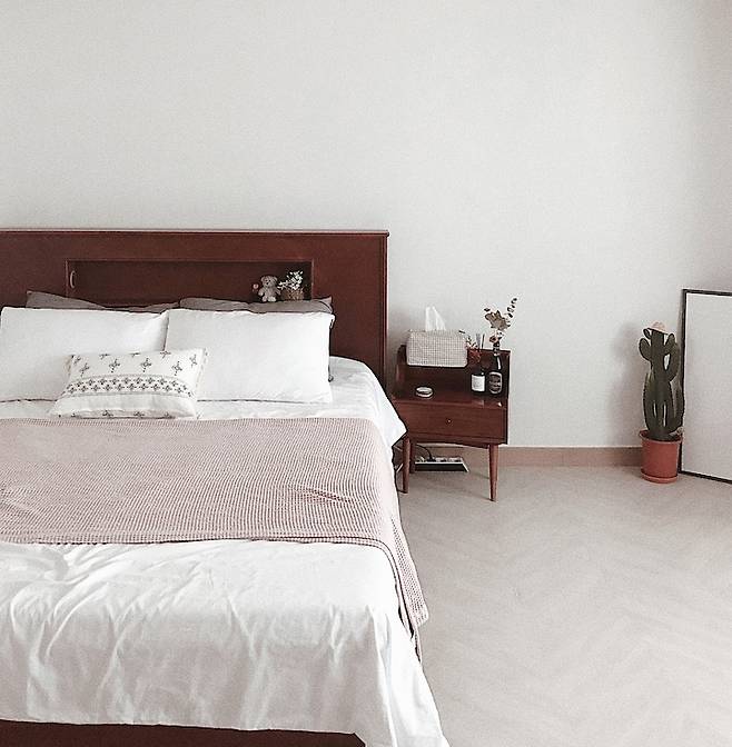 들어오자마자 침대가 보여서 침대 아랫부분만 보일 수 있도록 침대를 배치했고요. 침대 프레임은 TV장 가구와 색을 맞춰서 주문 제작한 거라 두 개가 세트처럼 잘 맞아서 좋았어요.