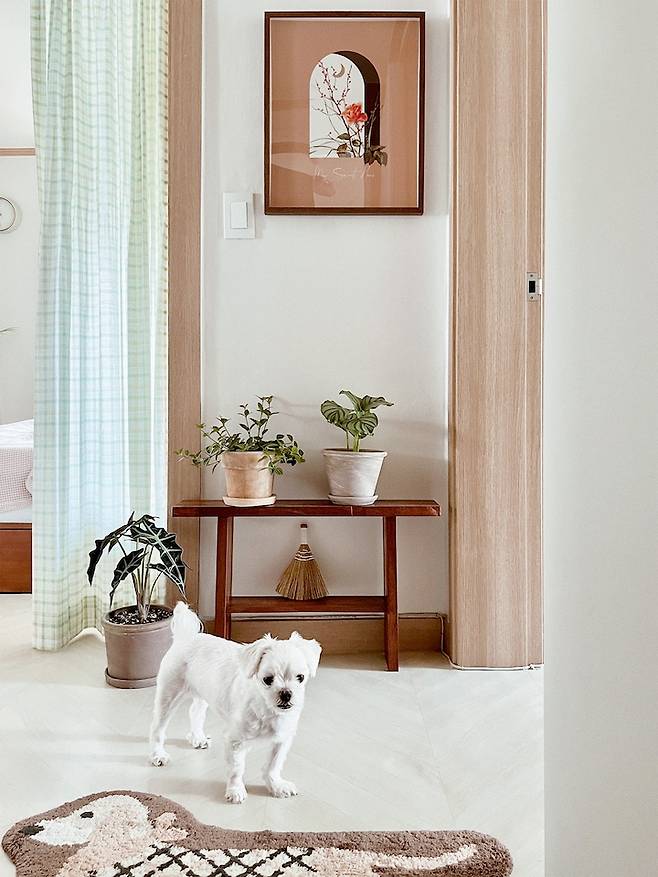 안녕하세요. 저희는 이제 2년 차 된 부부이며, 귀여운 똥강아지 송이와 함께 살고 있습니다. 저는 디자이너, 남편은 설비 관련된 일을 하고 있어요. 둘 다 만드는 걸 좋아해서 사부작거리면서 이것저것 만들면서 집 꾸미기를 하고 있습니다:)