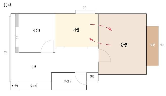 저희 집은 15평 치고는 그나마 공간이 넓게 빠진 편이에요. 도면상 거실 부분은 원래 방이었던 것 같은데 중간 문을 터서 거실로 만든 것 같은 느낌적 느낌... 저희 부부는 거의 거실에서 활동하는데, 잠만 자는 안방이 제일 큰 공간이라는 점이 너무 아쉬웠어요. 몇 번을 고민하다가 좀 더 효율적으로 공간 활용을 하기 위해 과감하게 거실과 안방을 바꿔보기로 했습니다.