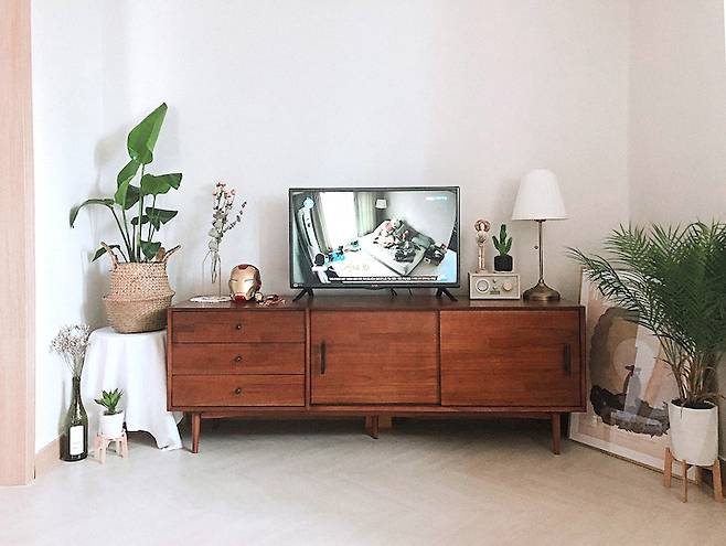 첫 거실 배치는 평범하게 한쪽은 TV장, 반대편은 소파 그리고 소파 옆 미니 냉장고.(라고 부르고 실상은 술장고)