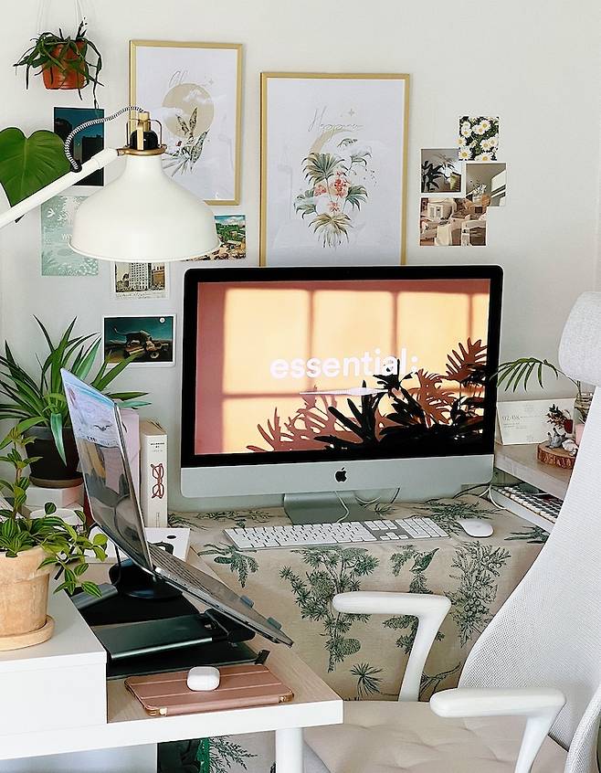 소파 옆 공간은 저의 작업 공간으로 꾸몄어요. 디자인 작업을 할 때 필요한 맥북+추가 모니터, 그리고 업무용 PC까지 모니터만 총 3대를 사용해야 해서 최대한 편하게 작업할 수 있도록 배치했습니다.