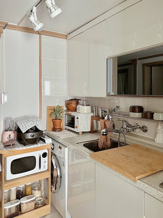 가뜩이나 좁은 주방에 세탁기까지 있어서 옆에 수납장을 놓을 수도 없어서, 고민하다가 이동식 트롤리를 개조해서 사용하고 있어요. 원래 밥솥이나 전자레인지를 넣을 수 없는 구조인데 위에 합판을 재단해서 얹어놓고 쓰고 있습니다.