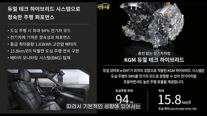 복합 연비는 액티언 하이브리드(넥센 타이어 기준)가 15.0km/l, 토레스 하이브리드(20인치 기준)가 15.2km/l로 근소한 차이를 보이고 있다. 액티언 하이브리드에 미쉐린 흡음 타이어를 선택할 경우 14.9km/l로 소폭 낮아진다. 이러한 연비 차이는 두 차량의 공차 중량 차이(액티언 하이브리드 1,730kg, 토레스 하이브리드 1,685kg)에서 비롯된 것으로 보이며, 운전 습관에 따라 충분히 상쇄될 수 있는 미미한 수준이라는 분석이다.