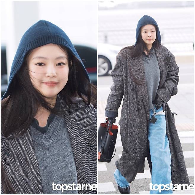 일반적인 모자 대신 니트 소재의 후드를 선택하면서 얼굴선을 부드럽게 감쌌고, 바람이 부는 공항에서도 자연스럽게 어우러졌다.