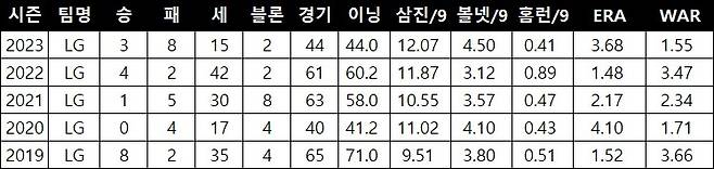 캠프 MVP라는 훈장까지 달아주며 신뢰를 보냈지만, 정작 뚜껑을 열어본 실전 마운드는 삭풍이 몰아치는 겨울이었다.
