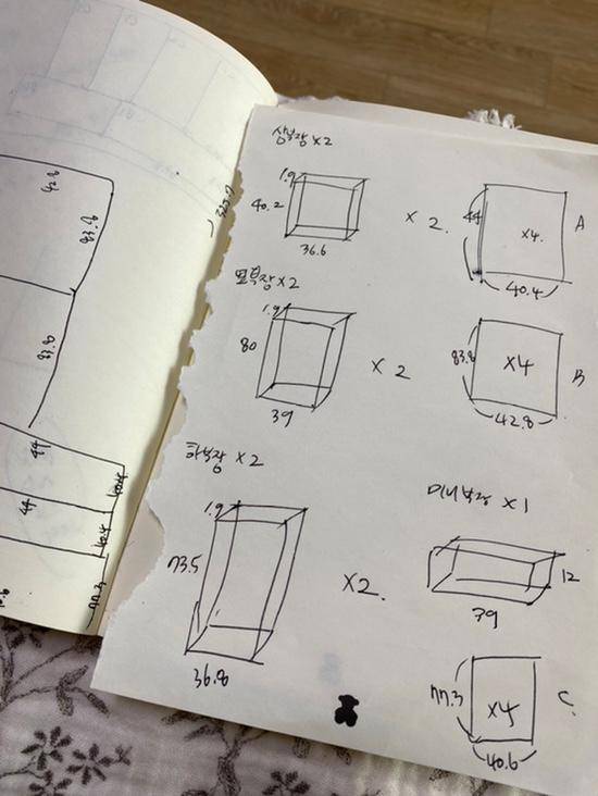 시트지 주문할 때부터 사이즈를 정확하게 확인해야 합니다. 모든 자재의 크기를 확하게 잰 뒤, 적정 시트지 사이즈를 도출하기 위해 도면을 그려보는 게 좋아요. 그래야 너무 남지도, 부족하지도 않는 크기로 주문할 수 있답니다.
