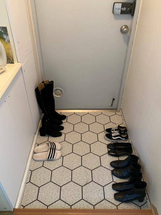 현관 바닥은 매트 VS 타일 고민하다가 코일 매트로 결정했어요. 심플한 육각형 무늬로 선택했답니다. 폭신폭신 느낌도 좋아 반려견이나 아기 있는 집들 특히 좋을 것 같아요. 주기적으로 탁탁 털어주고 물청소도 가능하다고 하니 세척도 문제없을 듯합니다.