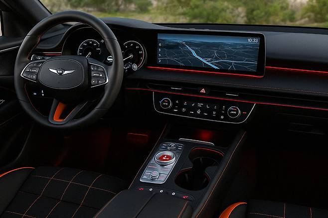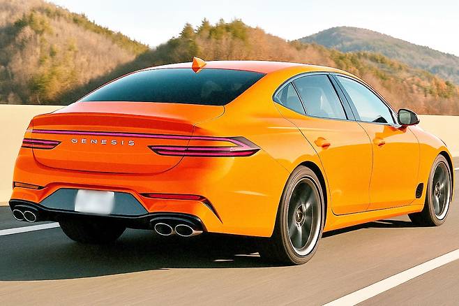 후면부 역시 존재감을 드러낸다. 트렁크 라인을 따라 수평으로 이어진 테일램프는 제네시스 디자인의 시그니처인 두 줄 램프 형식을 그대로 따르면서, 4개의 원형 듀얼 배기구로 고성능 모델임을 확실히 각인시킨다. 후드부터 루프, 테일로 이어지는 라인은 낮고 길게 깔리며 전통적인 스포츠 세단 비율을 현대적으로 재해석한 듯하다.