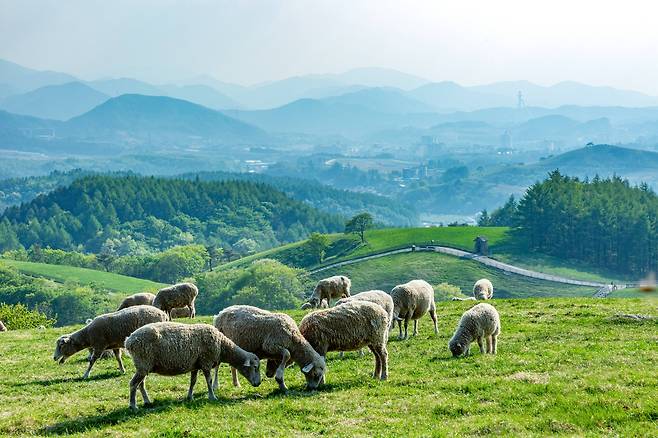 초록빛 물결 위로 양떼들이 흩어져 있는 모습을 배경 삼아 찍으면, 해외 초원 부럽지 않은 감성 사진이 완성됩니다.