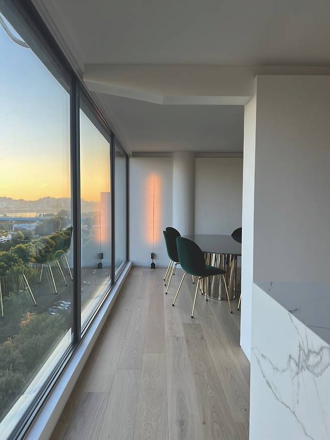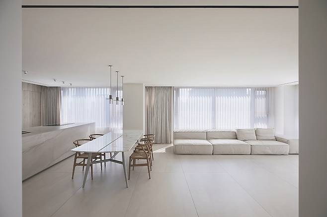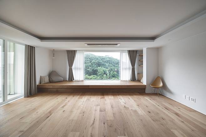 전원주택 거실_남향 대형 통창에 IoT 롤러 블라인드를 설치해 스마트싱스 연동으로 여름엔 자동 차단, 겨울엔 자동 개방 시나리오 설정. 전기료 15% 절감