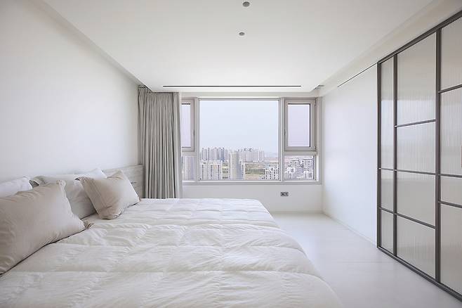 프리미엄 아파트 침실_구글홈과 연동된 IoT 커튼 시스템. ‘오케이 구글, 굿모닝’ 명령어로 커튼 열림 + 조명 50% + 전기포트 작동. 아침 루틴에 최적화된 활용