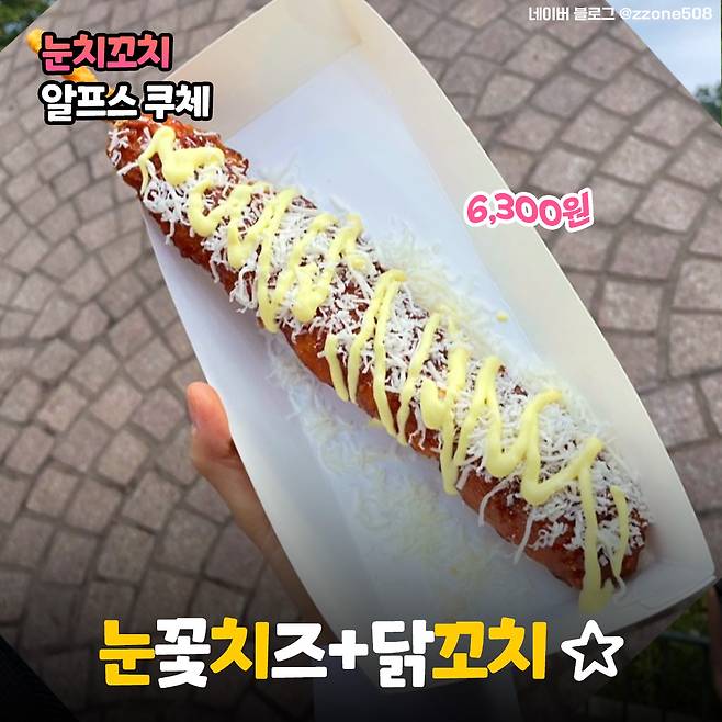 다섯 번째는 '눈꽃치즈'가 뿌려져 있는 꼬치인 <요리조리 눈치꼬치>에요. 비주얼만 봐도 찐맛도리 향기가 솔솔 풍기지 않나요? 실제로 에버랜드 주전부리 중에서 눈치꼬치를 1등으로 꼽는 분들이 정~말 많을 정도에요!