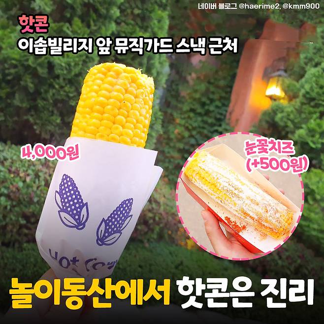 가장 먼저 픽한 간식은 놀이동산에서 먹을 때 제일 맛있다는 버터 바른 옥수수 <핫콘>이에요. 놀이동산에서는 흔치 않은 줄서는 간식 '맛집'이라고 해요. 특히 옥수수를 미리 만들어 두는 게 아니기 때문에 10분 이상씩 기다려야 할 때가 많다고!!