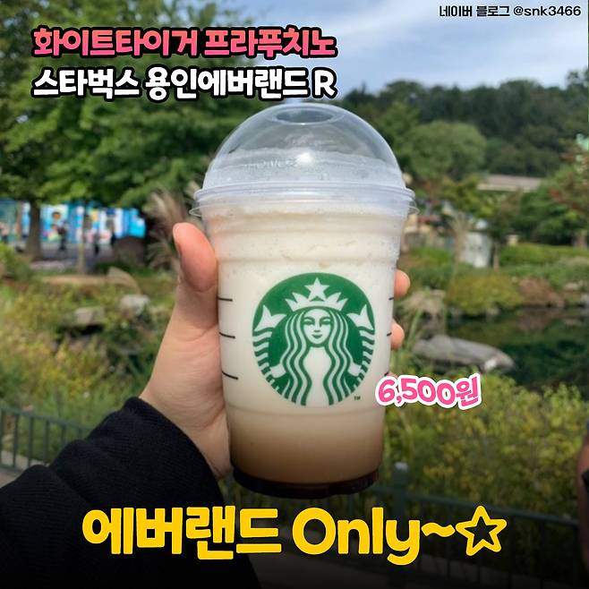네 번째는 에버랜드 스타벅스에서만 먹을 수 있다는 스페셜 메뉴인 <화이트 타이거 프라푸치노>에요! 기본 사이즈가 그란데여서 넉넉하게 마실 수 있답니다. 흑당시럽으로 에버랜드 백호의 줄무늬를 표현했다는데 선명하게 보이지는 않아서 아쉽... 뭔가 정체성이 흐릿해지는 느낌이랄까요?