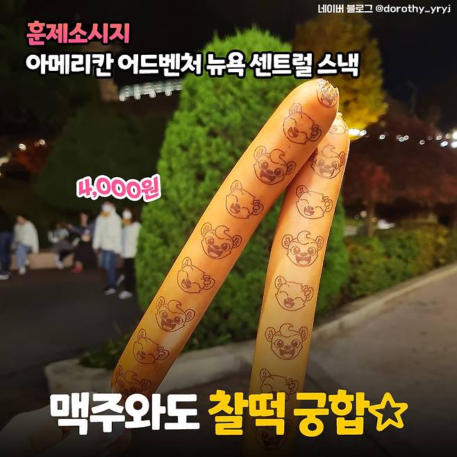 여섯 번째는 귀여운 캐릭터 도안이 박힌 <훈제소시지>!! 캐릭터만 빼면 흔한 비주얼이지만 훈제로 만들어진 거라 풍미가 남달라요. 흐르는 소스가 없어서인지 놀이기구 줄에서 훈제소시지를 드시는 분들이 꽤 많으시더라구요.