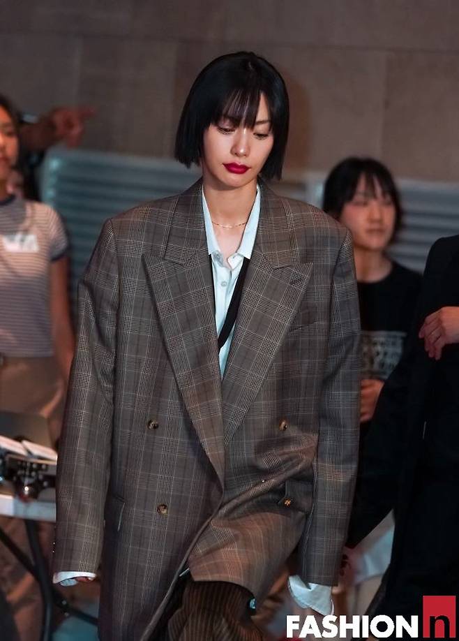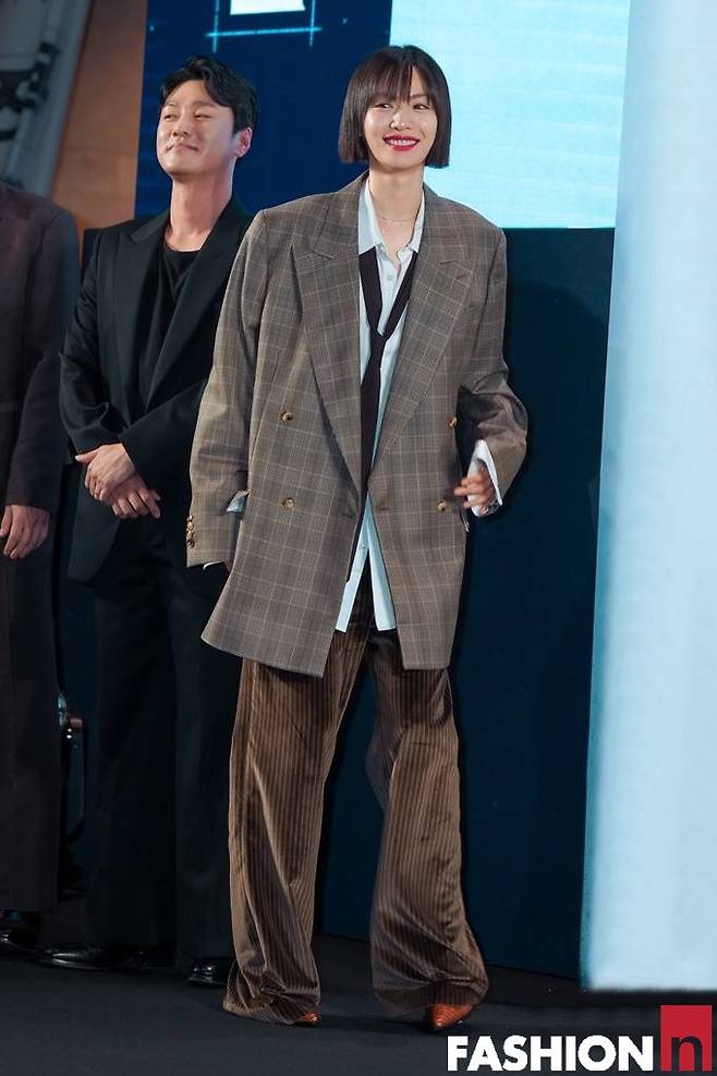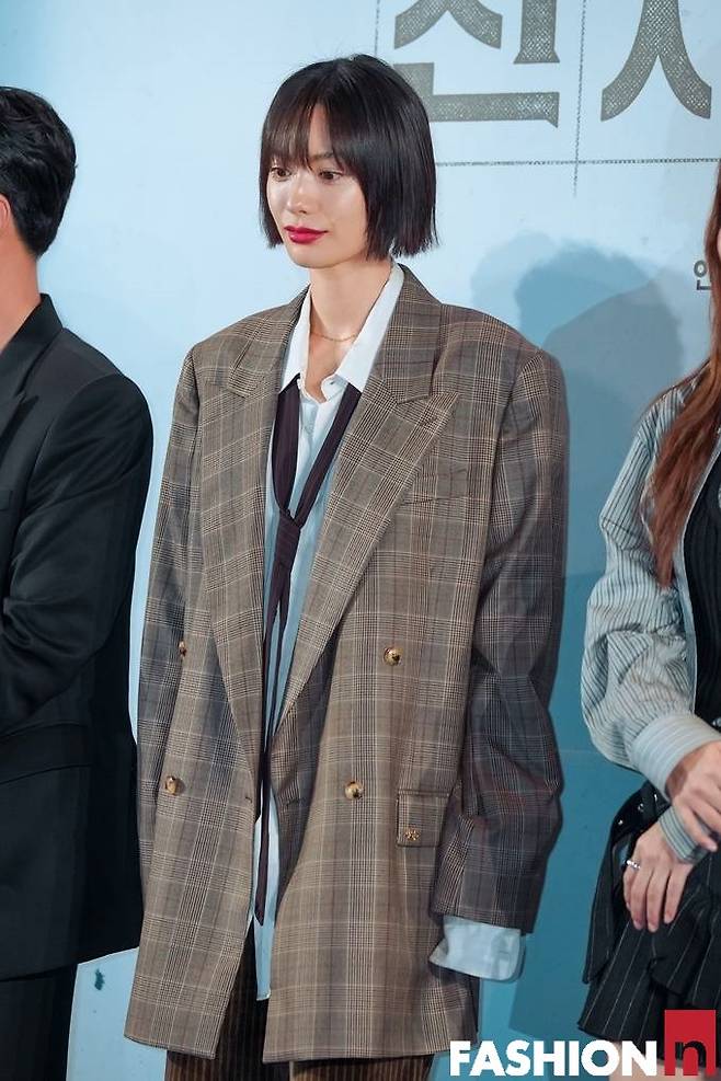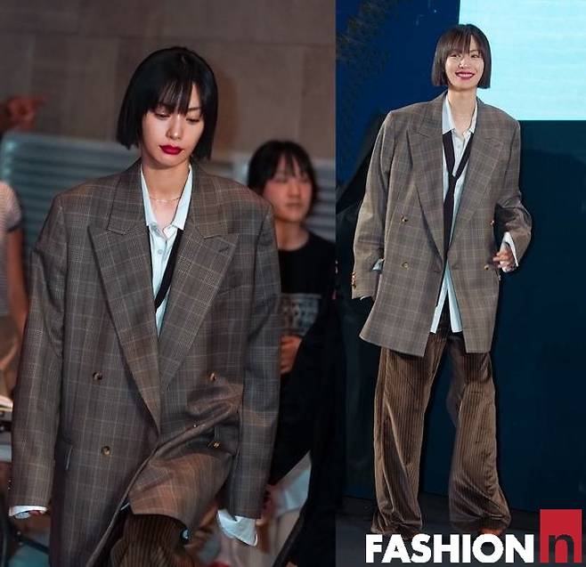 이날 나나는 오버사이즈 체크 재킷과 브라운 코듀로인 팬츠, 여기에 셔츠와 넥타이를 매치한 복고풍의 대디룩으로 시선을 사로잡았다.