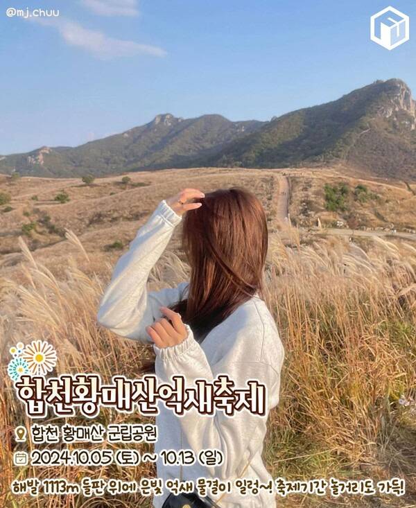 합천 황매산 억새축제는 10월 5일 토요일부터 10월 13일 일요일까지 9일간 진행됩니다. 해발 1,113m에 달하는 황매산에서도 해발 700~900m 일대의 넓은 구릉지인 황매평전을 은빛 억새가 가득 채워 매년 가을 경이로운 풍경이 펼쳐지는데요. 해발 850m부근의 정상 주차장까지 차량으로 오를 수 있어 힘들이지 않고 황매평원에 닿을 수 있습니다.