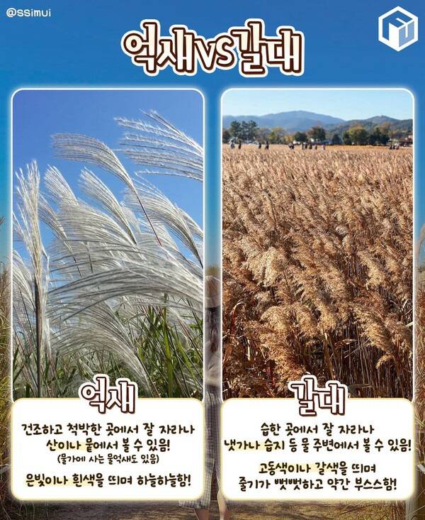 억새와 갈대의 가장 큰 차이점은 서식지에 있습니다. 억새는 주로 산이나 들처럼 건조하고 척박한 곳에서 잘 자랍니다. 반면 갈대는 강가나 어귀 등 습한 습지에서 잘 자라는데요. 간혹 물가에 사는 물억새가 있어 혼동하기 쉽습니다. 이런 경우에는 생김새로 구분할 수 있겠죠?
