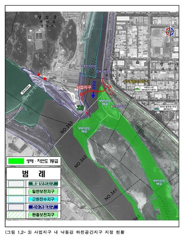 그런데 대구시가 공사를 벌이려는 하는 곳은 낙동강과 금호강이 만나 빚어 놓은 천혜의 자연습지인 달성습지 초입에 해당하는 곳이다. 달성습지는 대부분이 생태자연도 1등급지이고, 생태자연도 1등급지가 대구시의 사업 부지에 일부가 물려 있는 것이다.