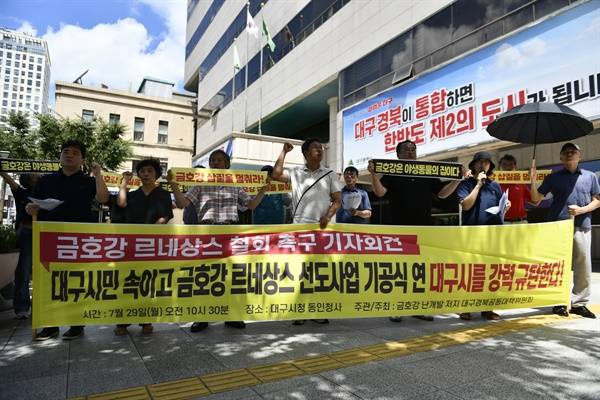| ▲ 대구시가 여론 수렴 없이 강행하고 있는 금호강 르네상스에 대해 성토하는 목소리가 드높다. 지난 8월 열린 금호강 르네상스 삽질 강행하는 대구시 규탄 기자회견 모습. |