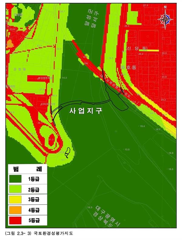 도면으로 확인되듯이 생태자연도 1등급지는 디아크 문화관광 활성화사업으로 지어지는 교량의 오른쪽 일부에 명확히 들어 있다. 생태자연도 1등급지는 '자연환경의 보전 및 복원' 구역에 해당하는 곳으로 개발이 불가한 곳이다. 그런데도 이 사업은 소규모환경영향평가를 통과했다.