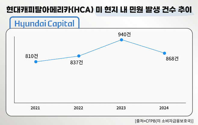 고객 민원도 갈수록 증가세다. 특히 계약서의 부정확한 내용에 대한 지적을 담은 이른바 ‘불완전 판매’ 관련 민원이 유독 많은 것으로 파악됐다. 르데스크가 지난 3년간 미국 금융소비자보호국(CFPB)의 신고 결과를 집계한 결과, 지난 2023년 현대캐피탈아메리카에 대한 신고 건수는 940건에 달했다. 2021년 810건을 기록했던 민원은 2022년 837건을 넘어 지난 2023년에는 처음으로 900건을 돌파했다. 지난해(868건)는 2023년에 비해 소폭 감소했지만 여전히 과거에 비해서는 높은 수준을 보였다.