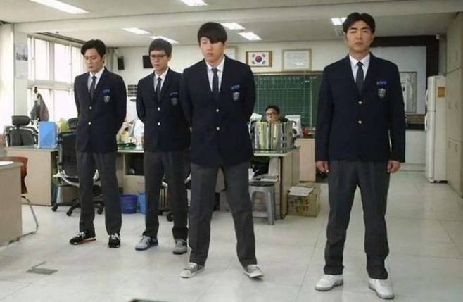공개된 사진엔 지난 2012년 방영된 '신사의 품격'에서 장동건 김민종 김수로 이종혁 등 주연 배우들이 40대의 나이에도 능청스럽게 교복을 입고 고교생 연기를 하는 모습이 담겼다.