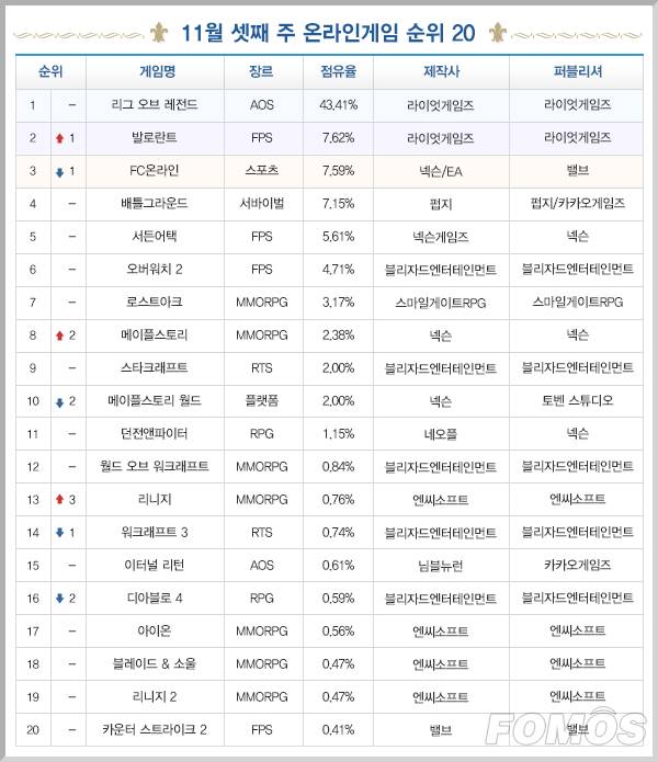 11월 셋째 주 온라인 게임 이용시간 순위에선 업데이트를 적용한 MMORPG 2종이 돋보였다.