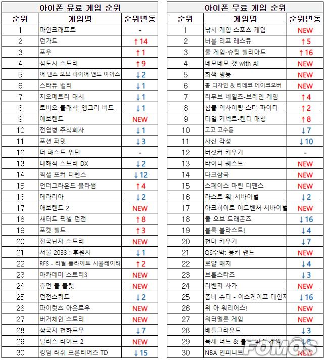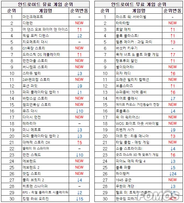 유료 게임 순위에서는 디펜스 장르인 '던가드'가 지난주 대비 14계단 크게 상승하며 2위를 기록했다.