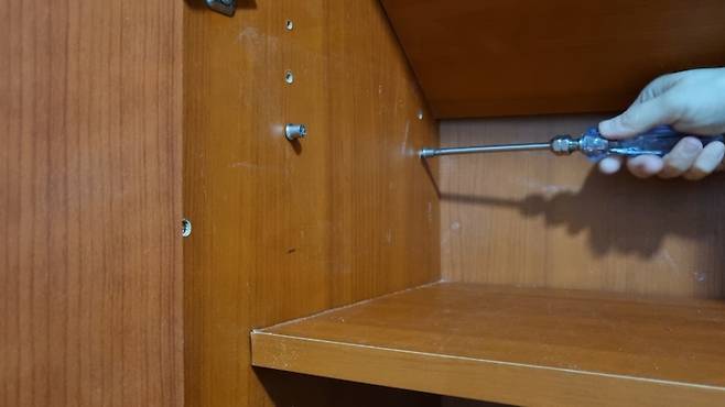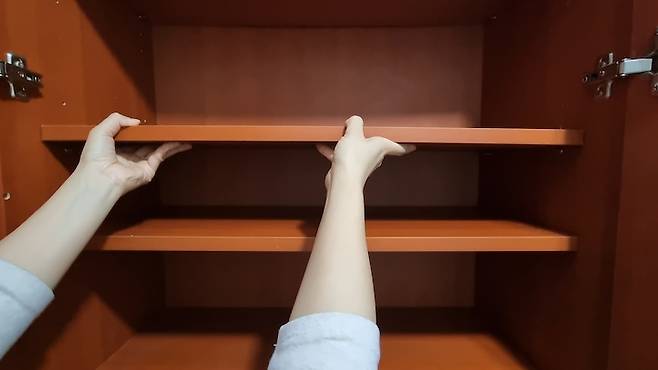 비어진 신발장을 깨끗이 닦아내고 다보를 옮겨 선반의 높이도 조절했어요.