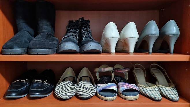 가지고 있던 신발 보관 정리대를 사용해 수납력을 높이고 선반마다 독립적으로 눌리거나 겹쳐진 것 없이