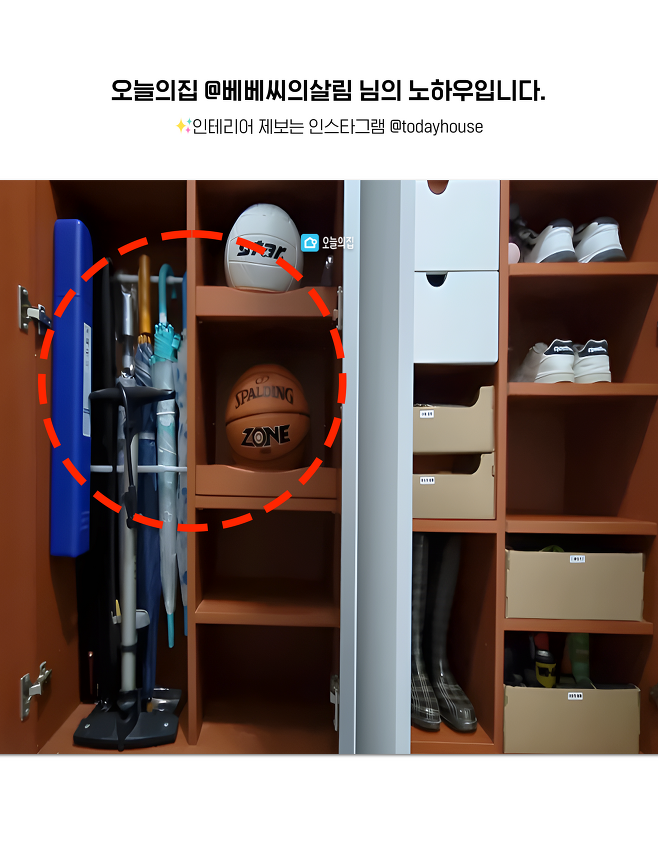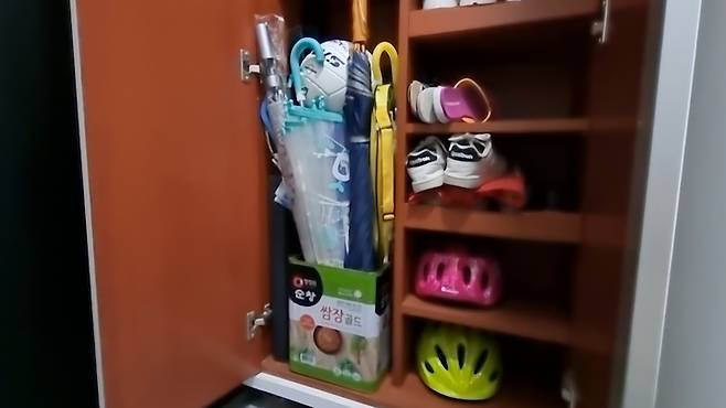 언뜻 보면 깨끗한 것 같지만...열어 보면 엉망진창😂 이사올 때 쌈장통에 대충 담아온 우산, 주렁주렁 걸려있는 줄넘기, 언젠가 신겠지 하며 버리지 못한 신발들...